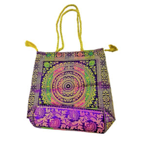 Introducing our banarasi silk brocade bag. with multicolor round zari motive Design royal design , feels royal Size: 12inch by 11.5 inchs