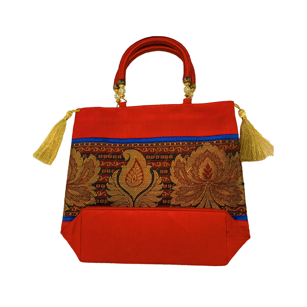 Introducing our banarasi silk brocade bag. with RED and Gold brocade Design royal design , feels royal Size: 9 inch by 10 inchs